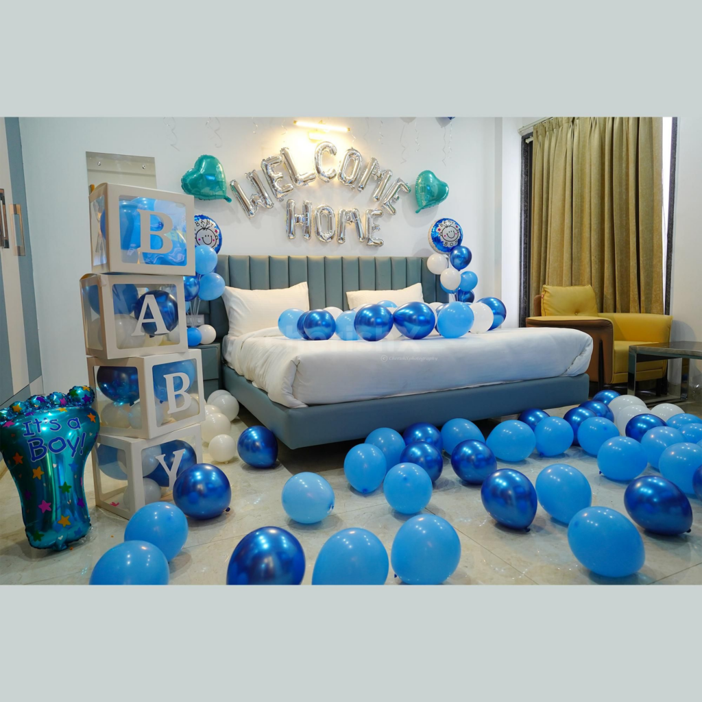 Room decoration, hall setups, balloon arches, name banners, and cozy décor ideas to warmly welcome the newborn at home.