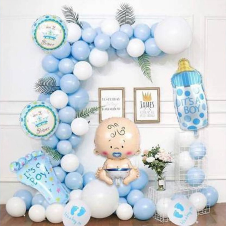 Blue, white, and pastel balloon themes, baby boy signage, teddy bear décor, balloon rings, and cute props for a joyful baby boy welcome.
